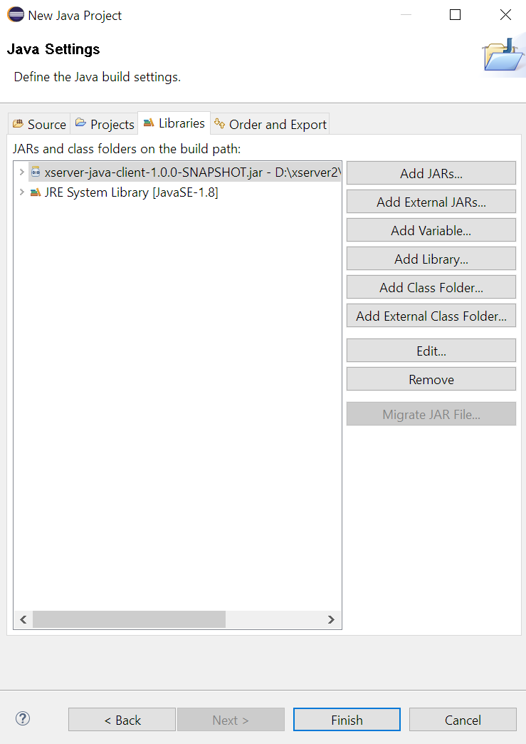 xserver-java-soap-client.jar(orxserver-java-soap-client-experimental.jar) as an external library and click finish.